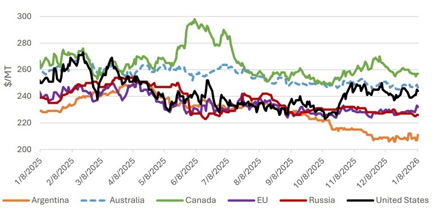 Цены на аргентинскую пшеницу также незначительно поднялись, но остаются самыми низкими по сравнению с другими странами. В связи с обильным урожаем пшеницы в Аргентине и ослаблением конкуренции со стороны черноморских поставщиков аргентинские власти снизили экспортные пошлины на вывоз пшеницы из страны. Из-за чего котировки аргентинской пшеницы стали самыми низкими на мировом рынке. Эксперты FAS USDA предрекают Аргентине самые высокие показатели экспорта и торговли пшеницей в сезоне 2025/26 МГ на фоне ослабления вывозных пошлин на эту культуру.