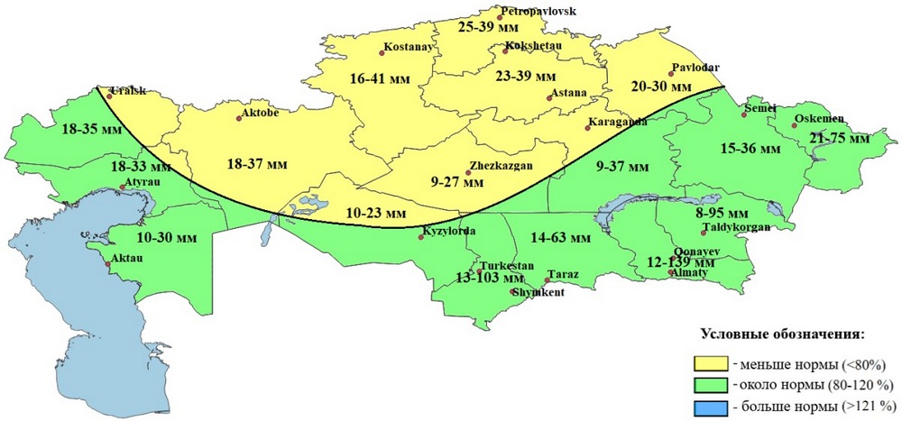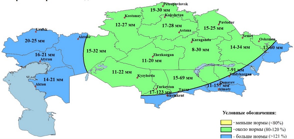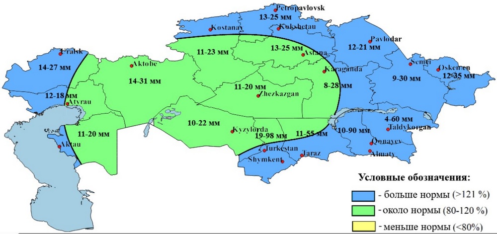 Выпадение осадков в мае предполагается около нормы на большей части территории Казахстана, меньше нормы – в Костанайской, Северо-Казахстанской, Акмолинской областях, на большей части Актюбинской, области Ұлытау, Павлодарской области, на северо-востоке Западно-Казахстанской, на крайнем северо-востоке Атырауской, на севере Кызылординской, на северо-западе Карагандинской областей. (Рис. 6)