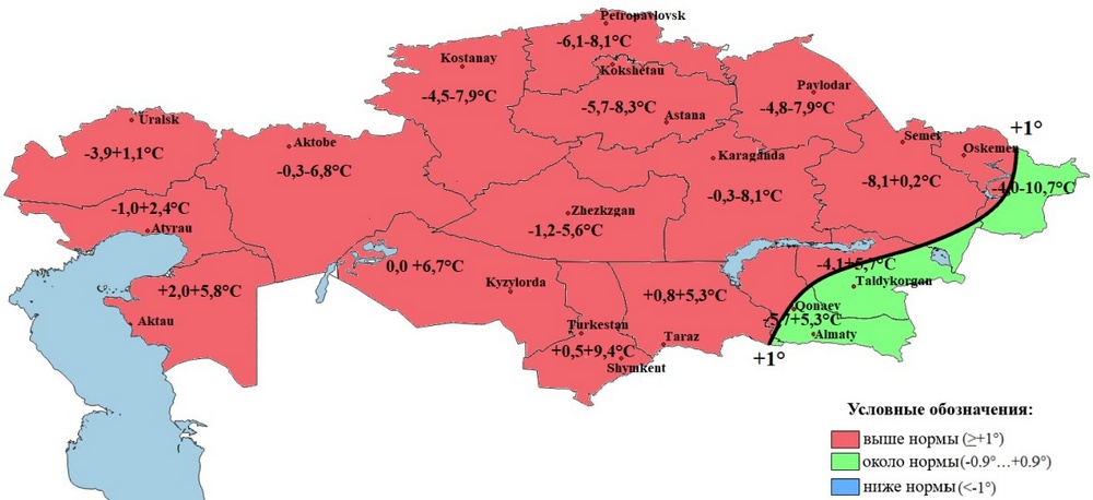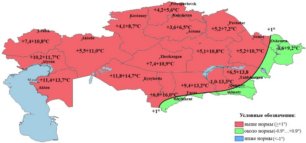 Рис. 1 Ожидаемые отклонения температуры воздуха от нормы в марте 2026 года в Казахстане, по данным РГП Казгидромет