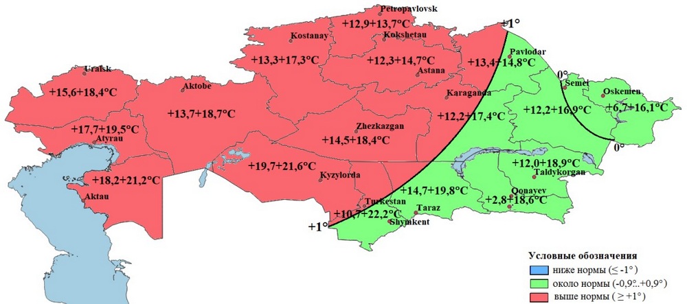 В мае средняя температура за месяц воздуха ожидается выше нормы на 1°С на большей части республики (Рис. 5), около нормы – в Алматинской, в областях Жетісу и Абай, в Восточно-Казахстанской области, на большей части Жамбылской области, в юго-восточной половине Туркестанской, Карагандинской, Павлодарской областей.