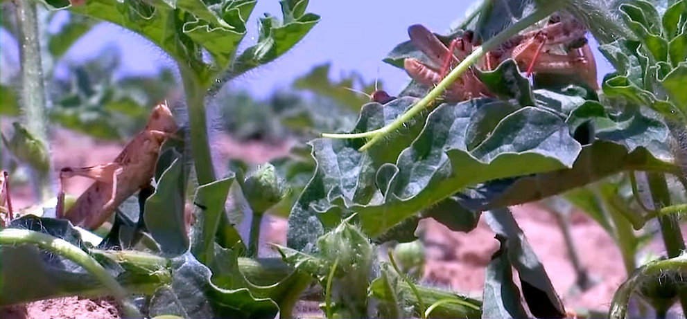 Но похоже, шансов вырасти и созреть у бахчевых не много. Под ногами земля буквально шевелится. Саранча налетает тучами и сжирает все на своем пути.