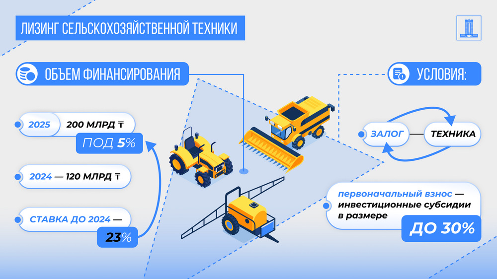 - повышена доступность лизинга сельскохозяйственной техники посредством увеличения объема финансирования за год на 80 млрд тенге до 200 млрд тенге под 5%, при этом сама техника может стать залогом, а взносом – инвестсубсидии;