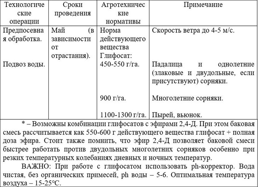 Хотелось бы еще раз подчеркнуть, что глифосаты применяют не только в какой-то определённый период, но и непосредственно перед посевом и сразу после посева в том случае, если посев производится сошниками анкерного или дискового типа. Однако главной задачей является уничтожение сорняков на ранних стадиях развития, поэтому это мероприятие может проводиться уже в начале или середине второй декады. Хозяйствам, работающим по минимальным и традиционным технологиям, нужно ограничиться проведением промежуточной культивации на глубину не более 4-5 см, также не допуская развития сорняков.