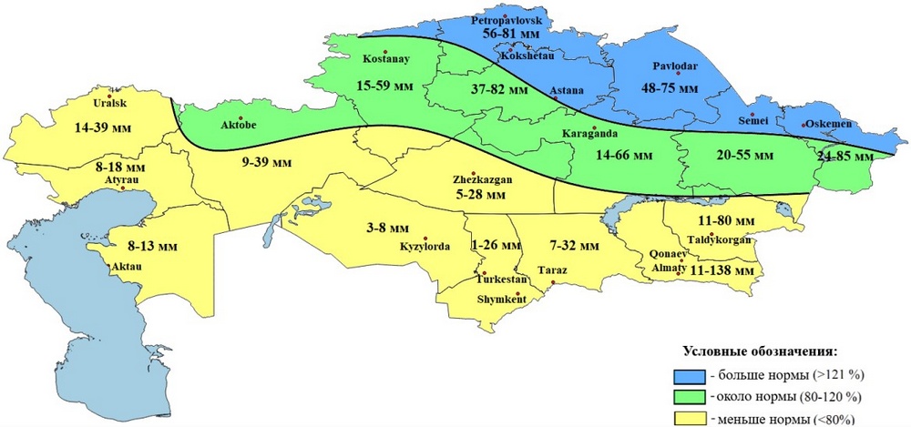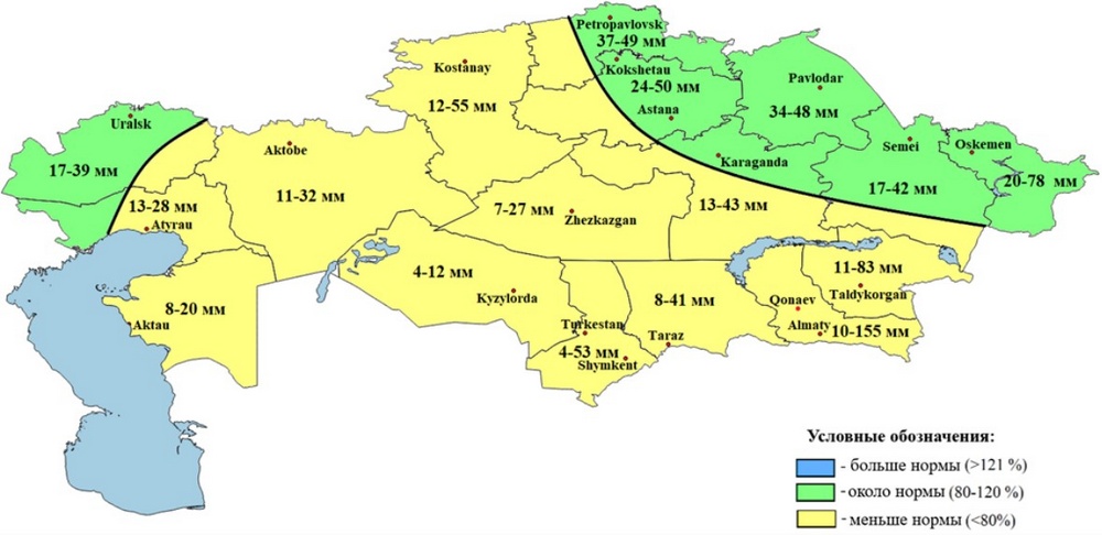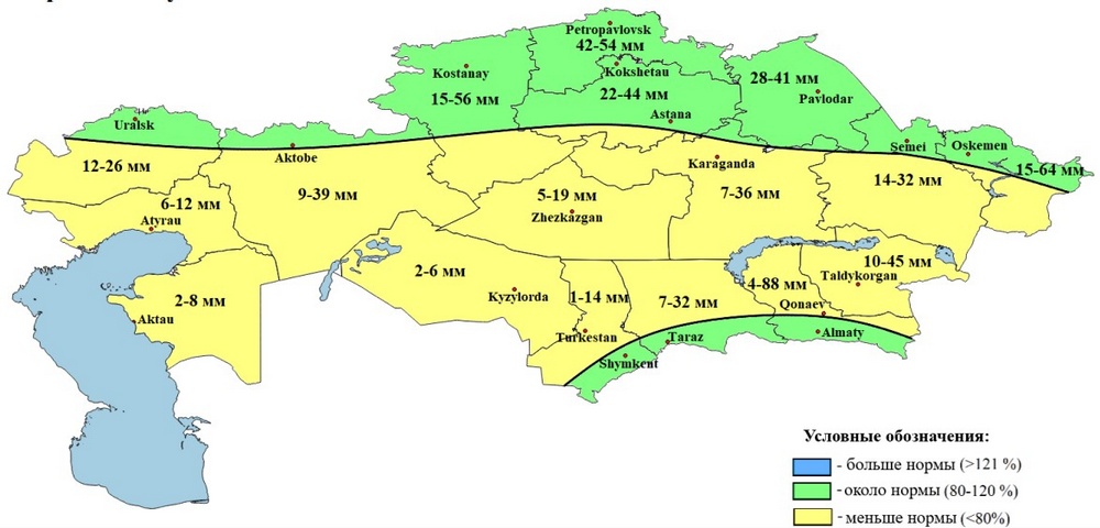 Количество осадков в июне прогнозируется меньше нормы на большей части республики, около нормы – в Павлодарской, в Восточно-Казахстанской областях, на большей части Западно-Казахстанской, Акмолинской, Северо-Казахстанской областей, области Абай, на западе Атырауской, на северо-востоке Карагандинской областей (Рис. 5).