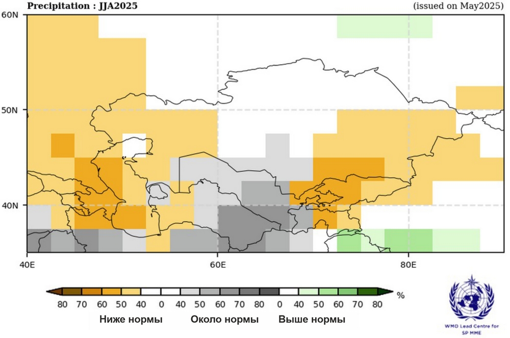 Прогноз количества осадков от ВМО в летние месяцы текущего года представлен на Рисунке 2. Согласно прогнозу осадки в пределах нормы выпадут в центральных и северных регионах Казахстана. Ниже нормы осадки ожидаются в западных, южных и юго-восточных областях.