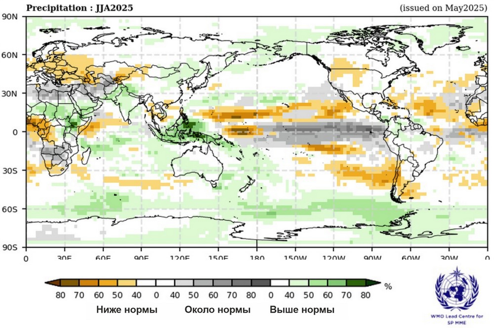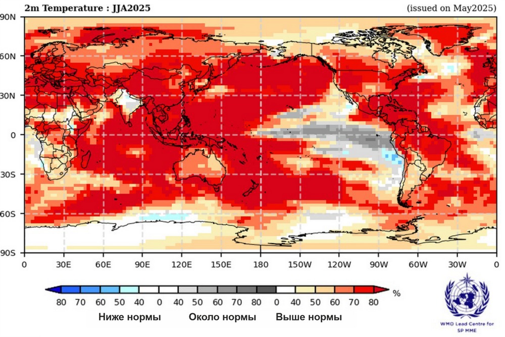 Отчет о температурном фоне мирового океана и о погодных феноменах Ла-Нинья и Эль-Ниньо ВМО не публиковало с марта текущего года. Согласно последней публикации летом 2025 года прогнозировались нейтральные условия ЭНСО, то есть ни Ла-Нинья, ни Эль-Ниньо. Несмотря на ЭНСО температура воздуха летом почти на всех участках мировой суши ожидается выше нормы (Рис. 3). В России, Украине, Европе, Северной Африке, на Ближнем востоке, в США, Канаде, Мексике и Бразилии прогнозируется жаркое лето.