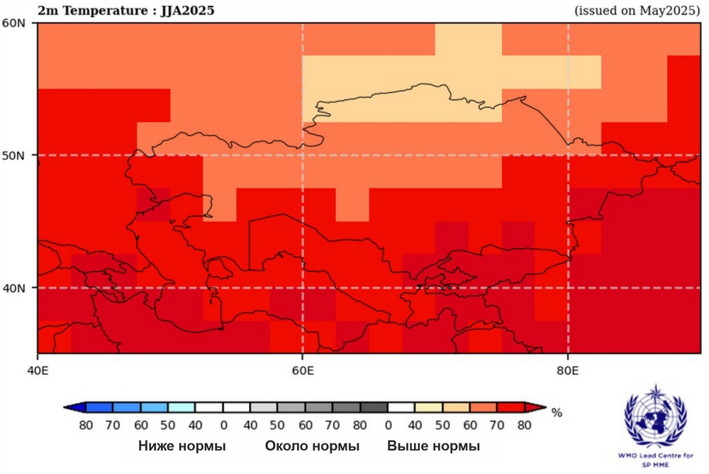 Всемирная метеорологическая организация (ВМО) опубликовала прогноз температуры и осадков на три летних месяца 2025 года. В соответствии с прогнозом температурный фон в Казахстане летом будет выше нормы (Рис. 1). За норму ВМО принимает среднемноголетний показатель температуры воздуха в нашей стране, рассчитанный по фактическим данным температуры, сложившейся в летние месяцы за период с 1993 по 2009 годы. Аналогично исчислена и норма по осадкам. Воздух летом 2025 года в нашей республике прогреется выше нормы. Особенно в южной половине территории Казахстана, там температура будет на 70-80% выше нормы. В северной половине эксперты ВМО прогнозируют температуру на 40-70% выше нормы.
