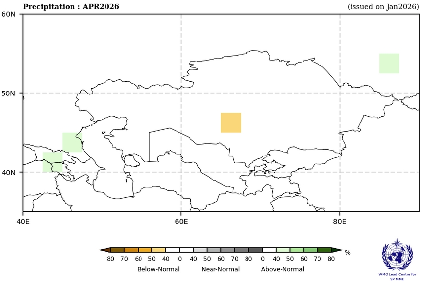 Рис. 4 Отклонения количества осадков в Казахстане в апреле 2026 года, по данным ВМО