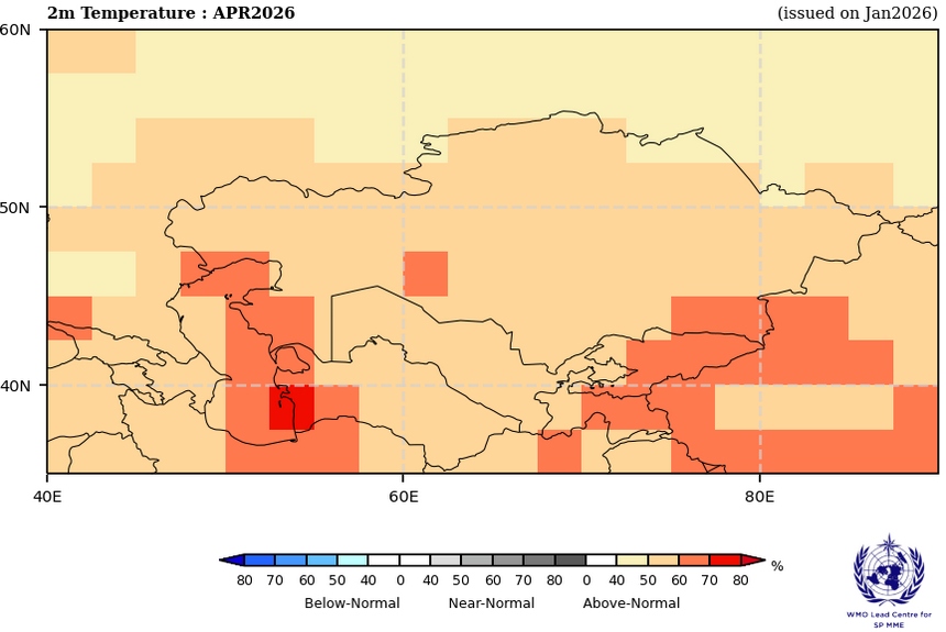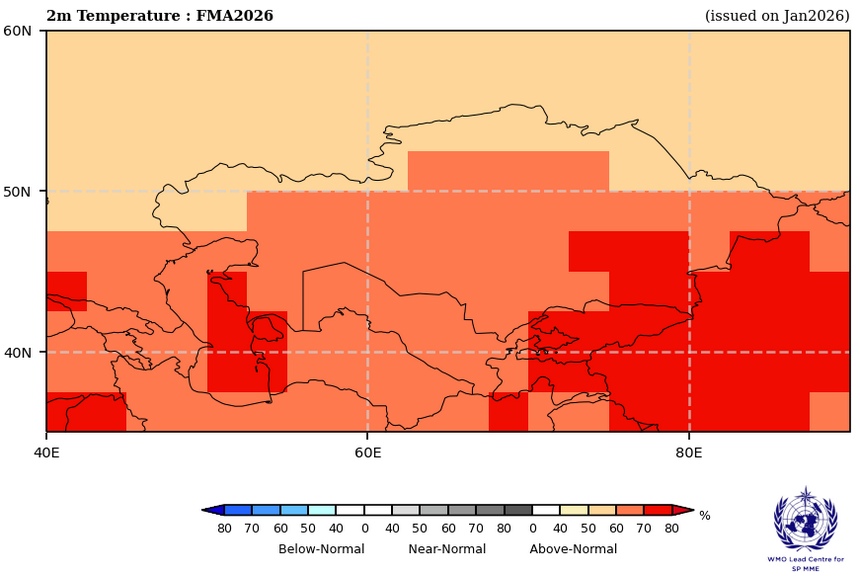 По данным ВМО температура воздуха в феврале-марте 2026 года в Казахстане будет выше нормы на 50-70% (Рис. 1).